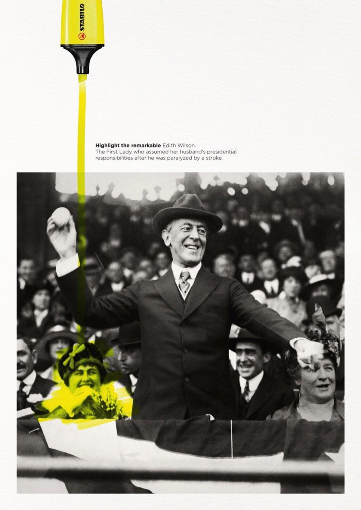 - Edith Wilson. The First Lady, who assumed her husband’s presidential responsibilities after he was paralysed by a stroke.